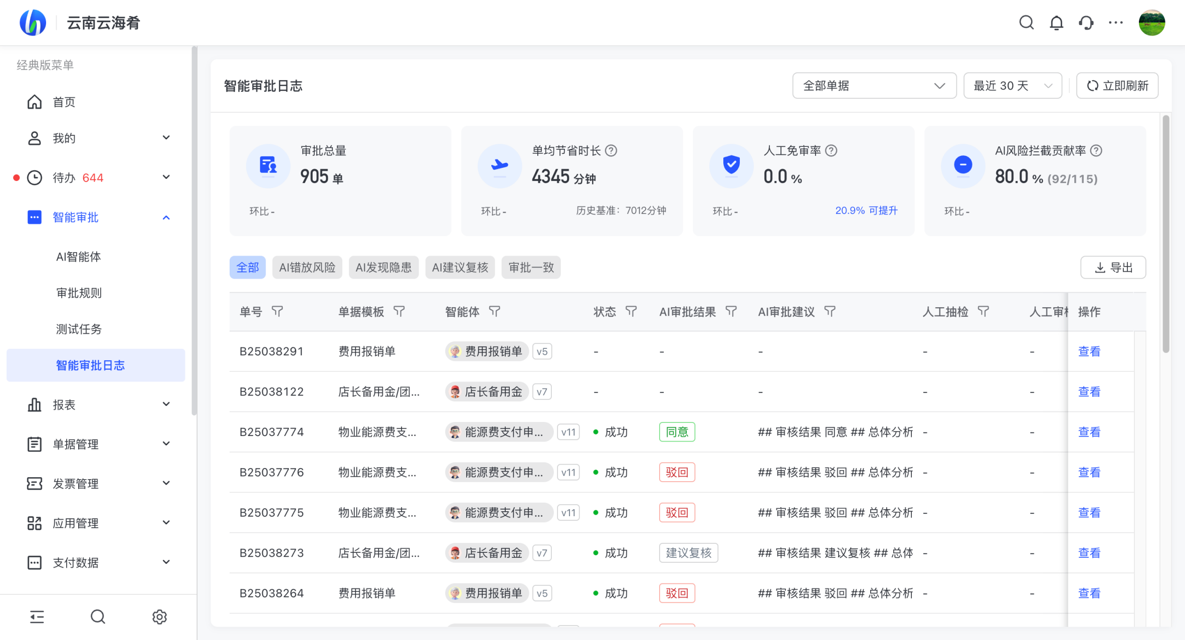 合思 AI 審批助手針對(duì)云海肴連鎖特性,搭建 “輸入單據(jù) - AI 批量審核 - 人工復(fù)核” 的流程,替代人工大量的重復(fù)比對(duì)工作;財(cái)務(wù)人員僅需聚焦 “金額過(guò)大需單獨(dú)提交”等關(guān)鍵節(jié)點(diǎn),人均管理門店效率間接提升,突破 “人效極限”。